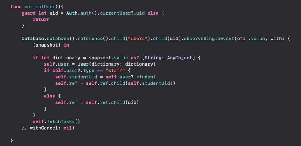 The planner tasks are loaded based on a UID. The planner page has a function currentUser() that checks whether the user is a student or staff. If they are a student, their personal UID is used as the database reference. If they are staff, that current student UID from the “student” member is what gets used as the database reference. Then a function fetchTasks() is called that uses the correct database reference for the specific user to load their weekly plan.