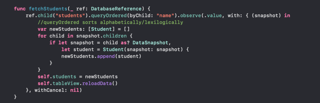 A mentor’s student list is loaded with the function fetchStudents(). This draws all the information from their “students” member and populates the tableView.
