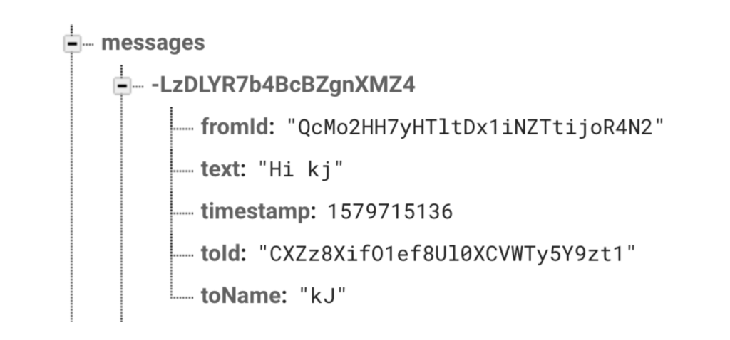 Each message instance is stored within Firebase with important information such as who the message was from, what the message contains, when it was sent, and who it was sent to.