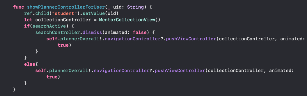 When a mentor selects a student from their list on their Students tableView, that student’s planner gets loaded. Mentors have another member, “student”, that contains one student UID at a time to show which student is currently selected, this gets set once they select someone from their list in the didSelectRowAt function and the showPlannerControllerForUser() function is called.